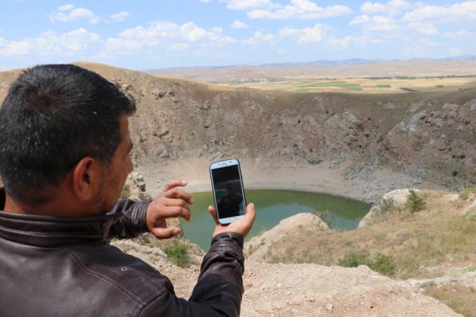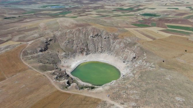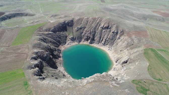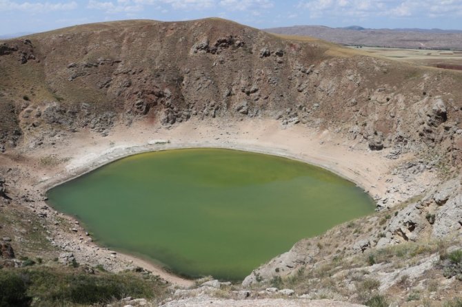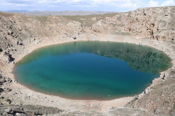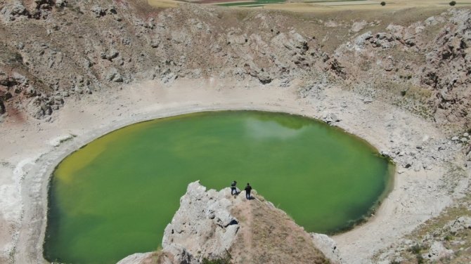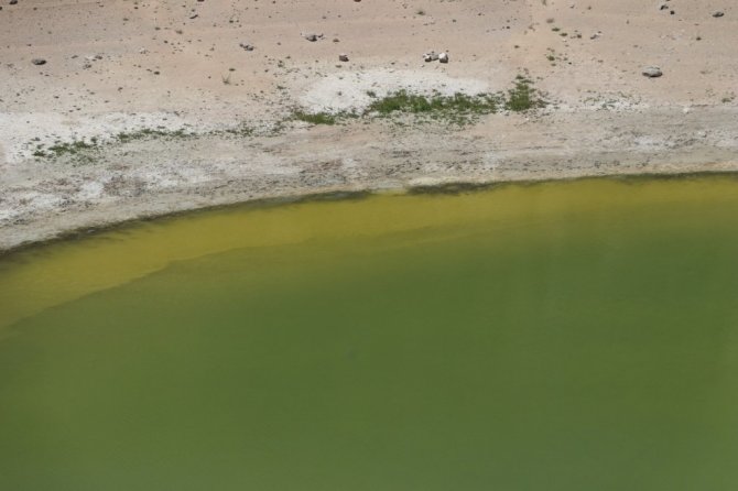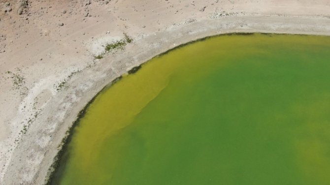 Turkuaz rengi ve büyüleyen güzelliğiyle Sivas'ın simgelerinden olan Kızılçan Gölü, kuraklık nedeniyle renk değiştirdi.