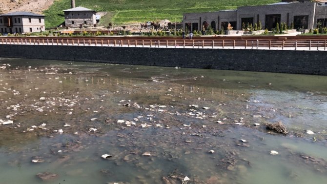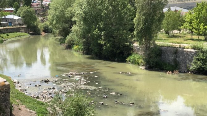 Bölgede etkili olan kuraklık Kars Çayı'nı da vurdu. Adete dibi görünen çayda zeminde biriken atıklarda gün yüzüne çıktı.