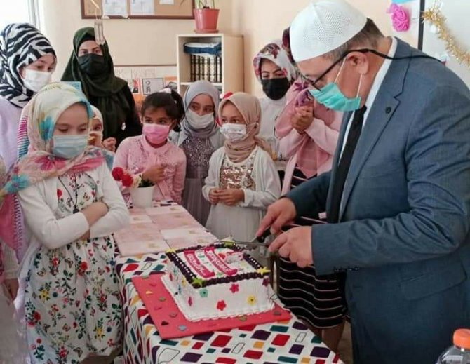 Kuran-ı Kerim'e geçiş programına katılan Kütahya İl Müftü Yardımcısı Mustafa Karaman, öğrencileri tebrik ederek, kendilerine pasta ikram etti.