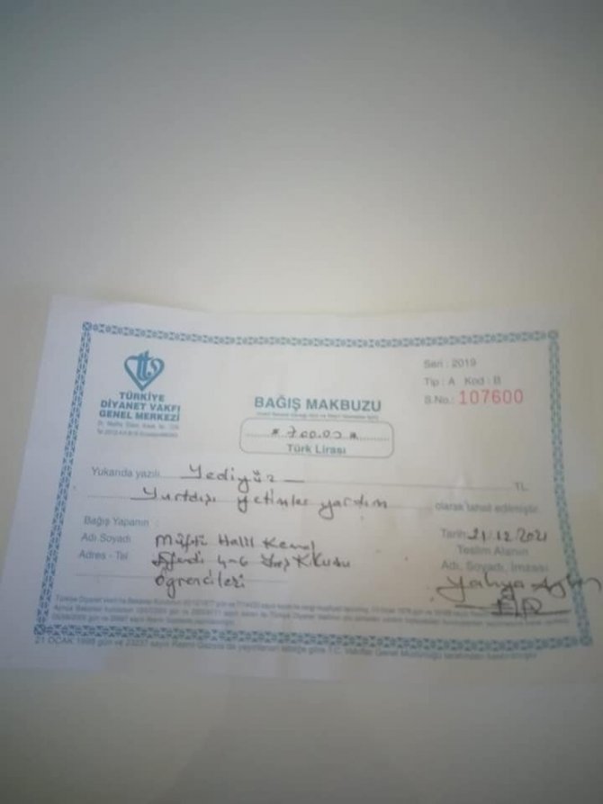 Gediz Müftü Halil Kemal Efendi 4-6 yaş Kur'an Kursu öğrencileri, değerler eğitimi iyilik ünitesi etkinliği kapsamında yardım kumbaralarında toplanan 700 TL'yi, yetimler ve ailelerine yönelik hazırlanan manevi destek projeleri, aileye gelir getirecek ekonomik destek projeleri gibi faaliyetlerde değerlendirilmek üzere Türkiye Diyanet Vakfı Gediz Şubesi'ne teslim ettiler.