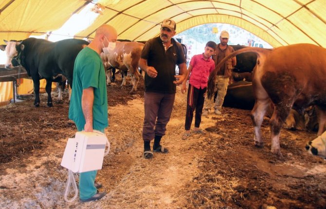 Ankara Çankaya Belediyesi, her yıl olduğu gibi Mühye Kurban Satış ve Kesim Alanı'nda kurbanlık hayvanların gebe olup olmadıklarını ultrason testi ile inceleniyor. Gebe olduğu tespit edilen hayvanların kurbanlık olması önleniyor.
