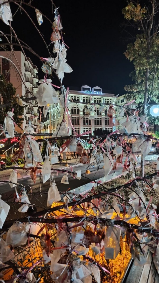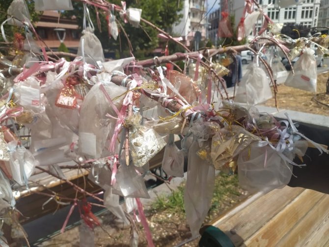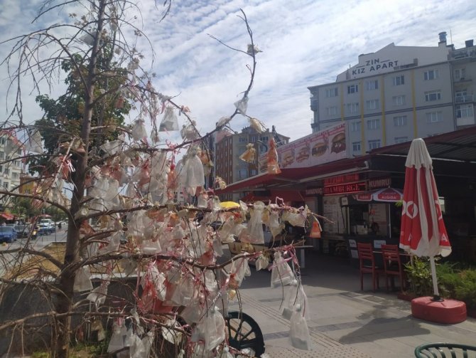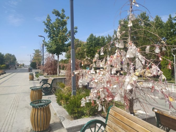 Eskişehir'de vatandaşlar, yürüyüş yaptıkları Gençlik Merkezi sokaktaki Hat Boyu yürüyüş yolunda kurumuş ağaçlara dileklerini yazıyorlar.
