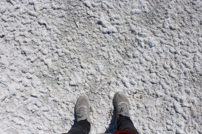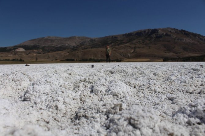 Kuruyan gölde oluşan tuz tabakası kış manzarası oluşturdu