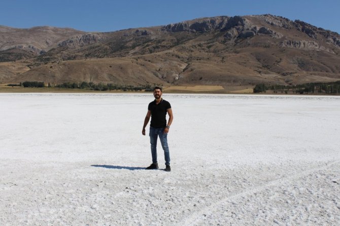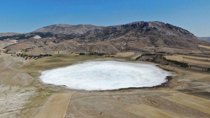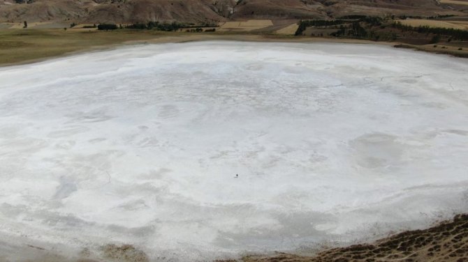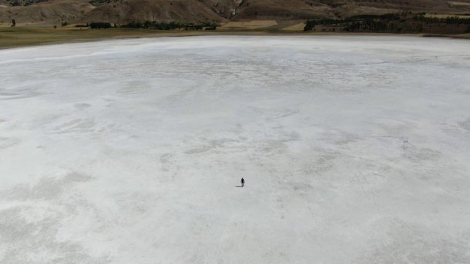 Sivas'ın Ulaş ilçesinde bulunan Kellah gölü kuraklık nedeniyle tamamen kurudu, gölden geriye Kış manzaralarını aratmayan beyaz tuz tabakası kaldı.