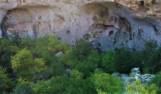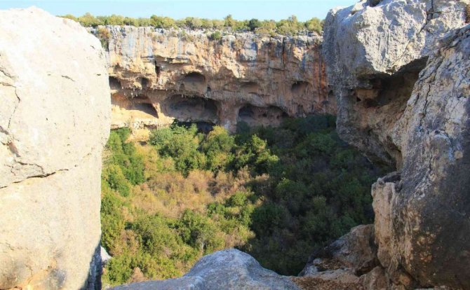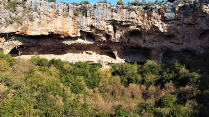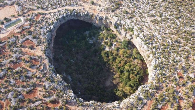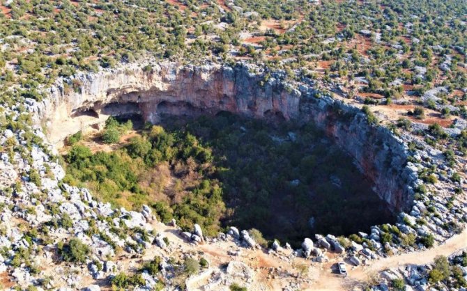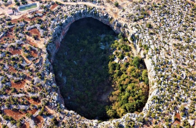 Mersin'de bulunan daha çok sosyal medyada paylaşılan ancak çok fazla kişinin yerini bilmediği doğallığı ile yüz yıllardır duran "Aşağı Dünya Obruğu" kuş bakışı ayrı bir görsel şölen sunuyor. Kuş seslerinin yükseldiği obruk, birbirinden farklı ağaçlarla küçük bir ormanı da andırıyor.