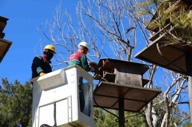 Menteşe Kurşunlu Cami meydanındaki kuş yuvaları su ile karıştırılan özel bir antibakteriel ilaç kullanılarak yapılan temizlik ve bakım çalışmasıyla kuş yuvaları daha temiz ve güvenli hale getiriliyor.