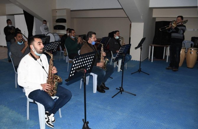Kuşadası'nda sokağa çıkma yasağının uygulandığı günlerde mahalleleri gezerek sergiledikleri canlı performans ile vatandaşların kalbinde taht kuran Kuşadası Belediye Bandosu ile Kent Orkestrası yeni stüdyosuna kavuştu.