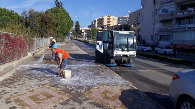 Kuşadası Belediyesi, 30 Ekim’de Ege Denizi’nde yaşanan ve Kuşadası’nda da şiddetli biçimde hissedilen depremin ardından çalışmalarını sürdürürken korona virüs tedbirlerini de elden bırakmıyor. Temizlik İşleri Müdürlüğü tarafından kent genelinde gerçekleştirilen dezenfeksiyon çalışmaları aralıksız sürüyor.