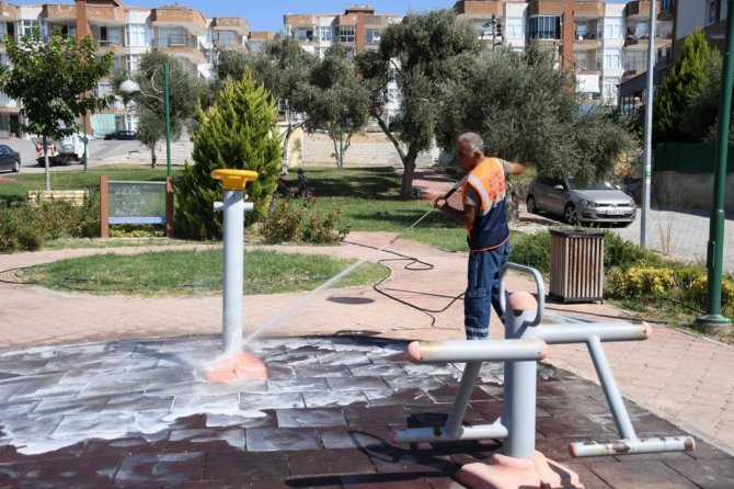 Kuşadası Belediyesi, Kovid-19 salgınına karşı yürüttüğü kararlı mücadeleyi sürdürüyor. Bu kapsamda Temizlik İşleri Müdürlüğü'ne bağlı ekipler kentte dezenfekte ve hijyen çalışmalarına hız kesmeden devam ediyor. Çalışmalarını son olarak Ege ve İkiçeşmelik Mahallelerindeki parklarda sürdüren ekipler yürüyüş yolları, çocuk oyun grupları, çöp konteynerleri ve spor aletlerini insan sağlığına ve çevreye zarar vermeyen bitkisel deterjanlarla yıkayarak temizledi. İlaçlama birimi ekipleri ise parklarda dezenfekte çalışması yürüttü. Doğa dostu temizlik ürünleriyle gerçekleştirdiği hijyen çalışmaları vatandaşlar tarafından büyük bir memnuniyetle karşılandı.