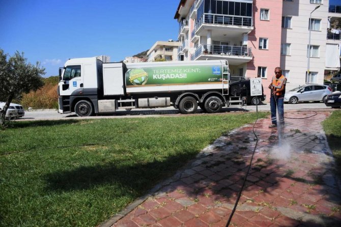 Kuşadası Belediyesi, korona virüs salgınına karşı kenti dezenfekte etme çalışmalarına ara vermeden devam ediyor.