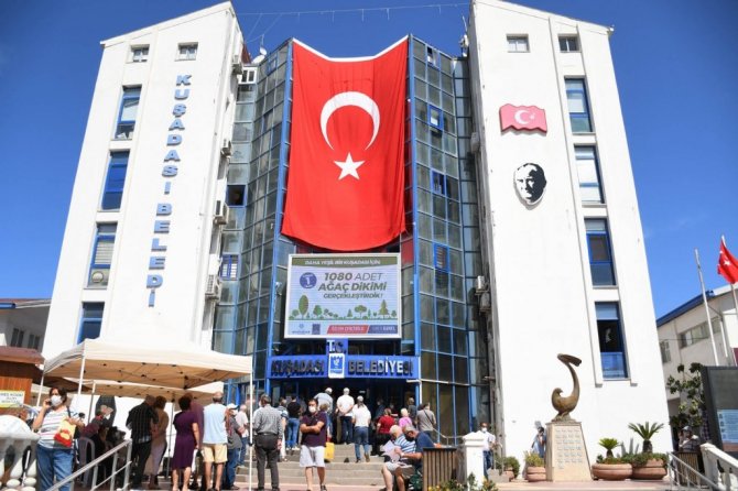 Kuşadası Belediyesi, 2021 yılı Emlak ve Çevre Temizlik Vergilerinin birinci taksidini ödemek amacıyla ana hizmet binası önünde yoğunluk oluşturan vatandaşların korona virüs salgınından korunmaları için gerekli bütün önlemleri alıyor. Sosyal mesafe kuralına uygun bir şekilde sıraya giren vatandaşlar, HES kodu sorgulamasının ardından içeriye alınarak veznelere yönlendiriliyor.