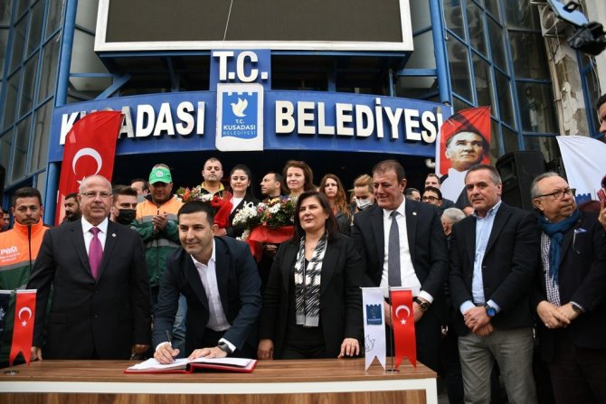 Kuşadası Belediyesi'ne bağlı Personel A.Ş ile Türk-İş'e bağlı Belediye-İş Sendikası arasında 730 işçiyi ilgilendiren toplu iş sözleşmesi görüşmeleri neticesinde 3 bin 100 TL olan en düşük işçi maaşının 5 bin 435 TL'ye yükseltilmesi çalışanlar arasında sevinçle karşılandı Uzlaşmanın sağlanmasının ardından Kuşadası Belediyesi Ana Hizmet Binası önünde bir imza töreni düzenlendi. Törene Aydın Büyükşehir Belediye Başkanı Özlem Çerçioğlu, CHP Aydın Milletvekili Hüseyin Yıldız, Kuşadası Belediye Başkanı Ömer Günel, CHP Kuşadası İlçe Başkanı Mehmet Gürbilek, belediye başkan yardımcıları, belediye meclis üyeleri ve Belediye İş Sendikası Aydın Şubesi yöneticileri katıldı. Törende Personel A.Ş işçileri, ellerinde taşıdıkları "Birlikte Güçlüyüz", "Anladık ki Yalnız Değiliz" yazılı dövizlerle her zaman kendilerine destek olan iki belediye başkanına teşekkür etti.