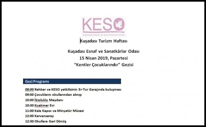 Kuşadası Esnaf ve Sanatkarlar Odası (KESO), 15-22 Nisan haftasında kutlanacak olan Turizm Haftası etkinlikleri kapsamında 4. ve 5. Sınıf öğrencilerinden oluşan 100 çocuk için “Kentler Çocuklarındır” gezisi düzenleyecek.