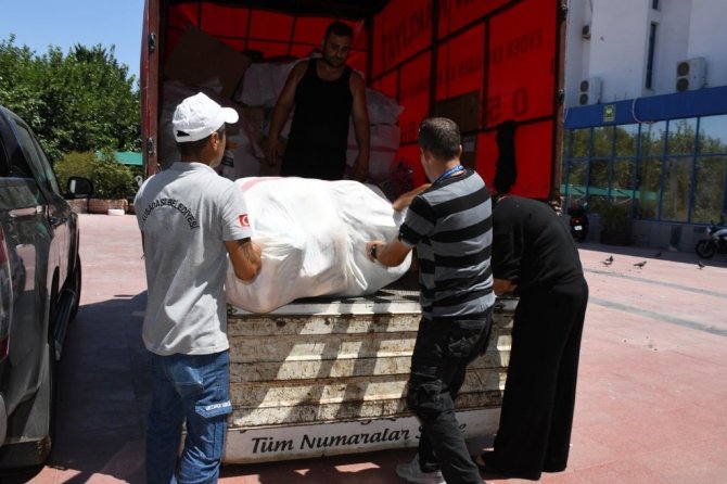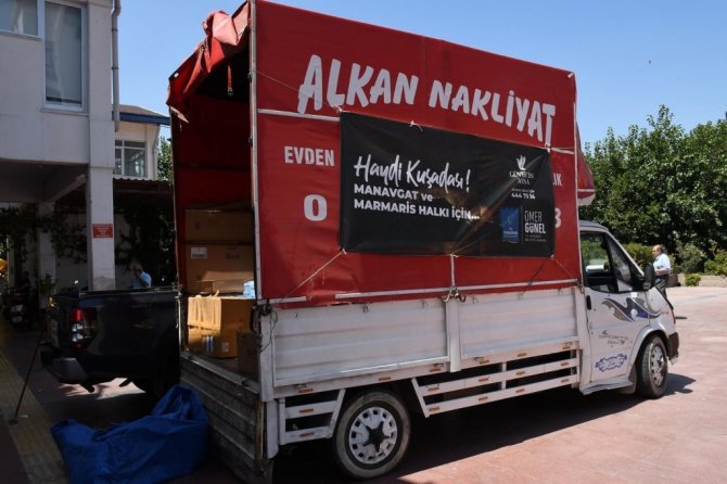 Kuşadası Belediye Başkanı Ömer Günel'in çağrısıyla yangın bölgeleri için başlatılan yardım kampanyası kapsamında toplanan malzemeleri taşıyan kamyon da Marmaris'e doğru yola çıktı.