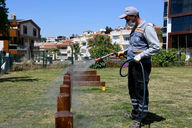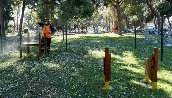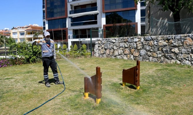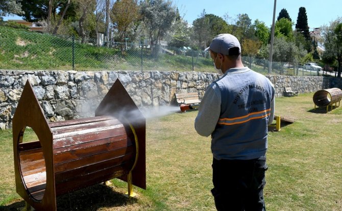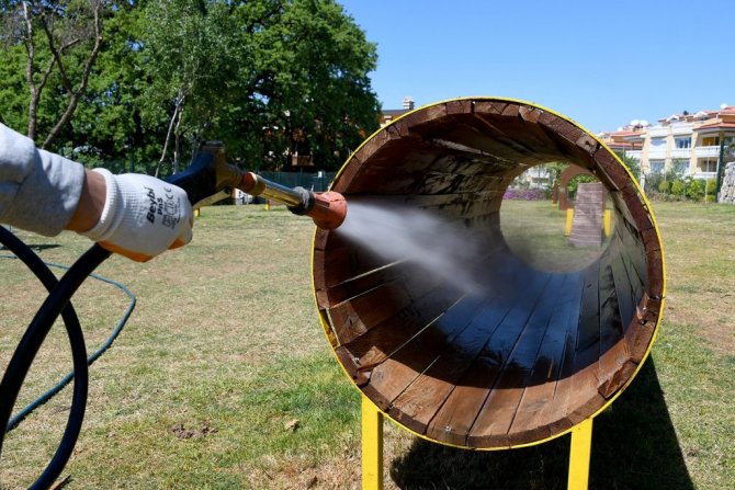 Kuşadası Belediyesi, havaların ısınmaya başlamasıyla birlikte köpek eğitim parklarında ilaçlama çalışmasına başladı.