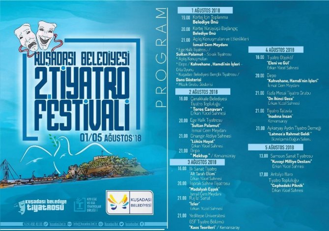 Kuşadası Belediyesi 2. Tiyatro Festivali, 1 Ağustos Salı günü saat 20.00’da Kuşadası Belediyesi Ana Hizmet Binası önünde oluşturulacak ve İsmail Cem Meydanı’nda sona erecek bir kortejle başlayacak. 5 gün boyunca devam edecek olan festival kapsamında Kuşadası’na gelen tiyatro grupları Kervansaray, Erkan Yücel Sahnesi ve İsmail Cem Dostluk ve Barış Meydanı ile Güzelçamlı Mahallesi’nde oyunlarını sergileyecek.