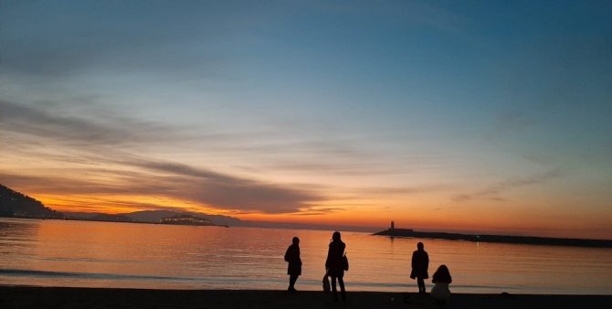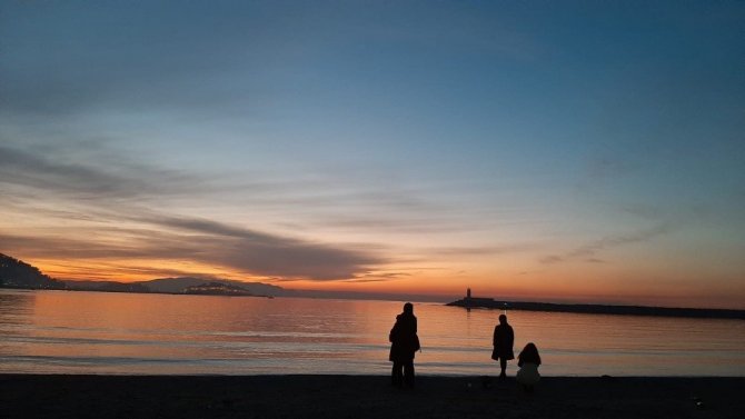 Aydın’ın Kuşadası sahilinde, güneşin batışı sırasında ortaya çıkan görüntüler ilgi odağı oldu. Gün batımının sunduğu doğal güzelliği izlemek ve fotoğraflamak isteyenler deniz kıyısına gelerek eşsiz manzaranın keyfini çıkardı.