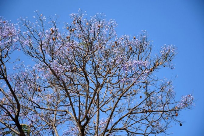 Kuşadası'nda kente estetik bir görünüm kazandırmak amacıyla geçtiğimiz yıl Kuşadası Belediyesi Park ve Bahçeler Müdürlüğü ekipleri tarafından farklı noktalara 250 jakaranda ağacı dikildi. Tropikal bir ağaç türü olan jakarandalar, havaların ısınmaya başlamasıyla birlikte çiçeklerini açtı. Ağaçların dallarını kaplayan mor renkli çiçekler, Kuşadası'nın cadde ve sokaklarına güzellik ve serinlik kattı. Yılın 6 ayı çiçek açan jakaranda ağaçları Türkiye'nin önemli turizm merkezlerinden Kuşadası'nda kartpostallık görüntüler oluşturdu.
