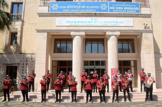 Kuşadası Belediye Bandosu, koronavirüs salgını nedeniyle evlerine kapanan vatandaşların moralini yerine getirmek için konser vermeye devam ediyor.