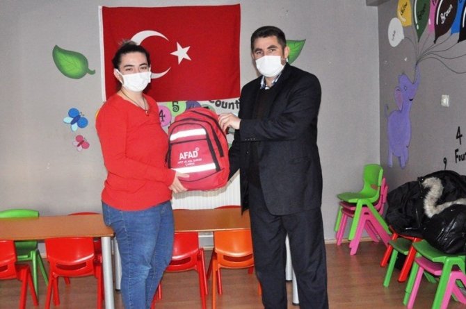 Eğitimin ardından İl Afet ve Acil Durum Müdürlüğü eğitmenlerince, okula afet ve acil durum çantası hediye edildi.