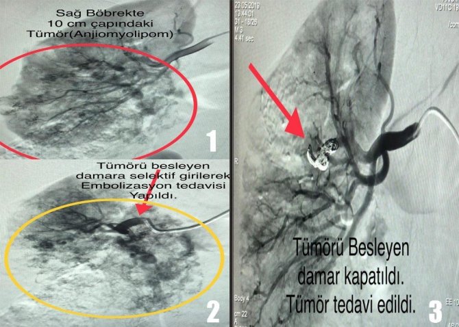 Kütahya Sağlık Bilimleri Üniversitesi (KSBÜ) Evliya Çelebi Eğitim ve Araştırma Hastanesi Girişimsel Radyoloji Bölümü’nde 10 cm çapında dev böbrek tümörü olan K.K. isimli kadın hastanın tümörü anjiografi ile embolizasyon (damar tıkama) yöntemiyle ameliyat yapılmadan 30 dakikada temizlendi.