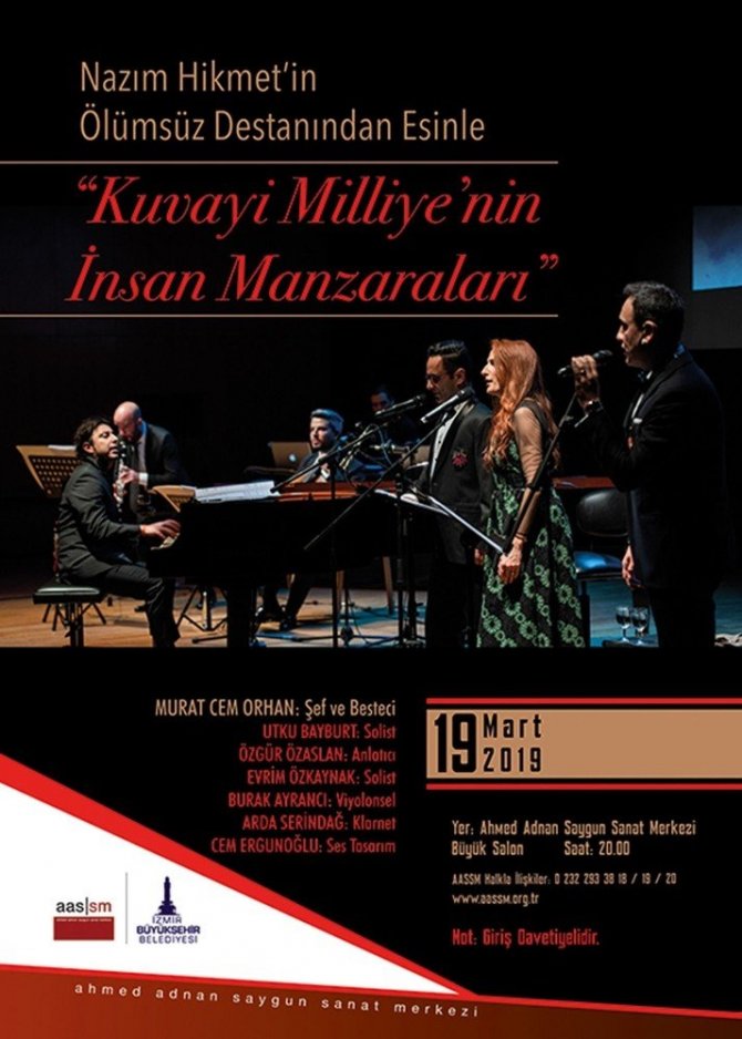 İzmir Büyükşehir Belediyesi Ahmed Adnan Saygun Sanat Merkezi, etkileyici bir konsere daha ev sahipliği yapacak. Ünlü orkestra şefi ve besteci Murat Cem Orhan’ın Nazım Hikmet’in ölümsüz eseri Kuvay-i Milliye Destanı’ndan esinlenerek hayata geçirdiği bir proje olan “Kuvay-i Milliye’nin İnsan Manzaraları” isimli konser, 19 Mart Salı akşamı gerçekleştirilecek. Büyük Salon’da saat 20.00’de başlayacak ücretsiz etkinliğe giriş davetiyeleri, 11 Mart saat 10.00’dan itibaren AASSM gişesinden dağıtılacak. Her sanatsever iki adet davetiye alabilecek.