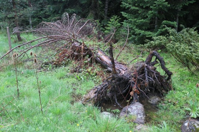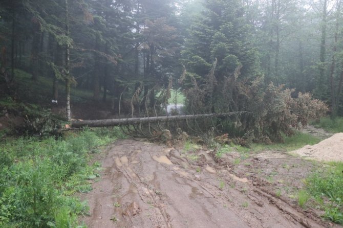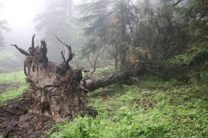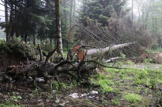 Bolu'da hafta sonu etkili olan kuvvetli rüzgara dayanamayan dev ağaçlar kökünden söküldü.