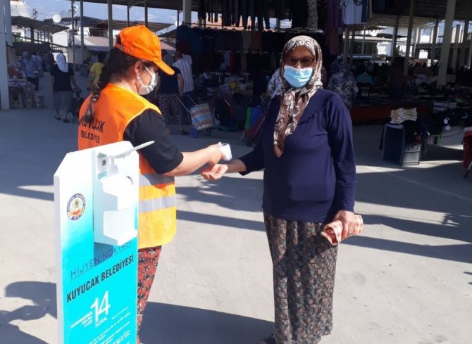 Kuyucak Belediyesi Korona virüs ile mücadele kapsamında, bütün mahallelerde kurulan halk pazarlarında çalışmalarına devam ediyor. Kuyucak Belediyesi Kültür ve Sosyal İşler Müdürlüğü personelleri tarafından vatandaşlar, tek tek ateş ölçümü yapılarak içeri alınıyor. Pazar girişlerinde kurulu olan dezenfektan stantları ile vatandaşların alışveriş öncesi ve sonrası ellerini dezenfekte etmeleri sağlanıyor. Zabıta ekipleri tarafından pazar alışverişi sırasında esnaf ve vatandaşlar sosyal mesafe kurallarına uymaları konusunda uyarılıyor.