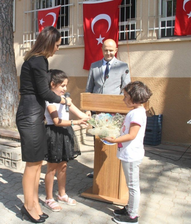 Pamukören İlkokulu 4. sınıf öğrencilerinden Selda Özer, okul hayatına ilk adımını atmış olan 1. sınıf öğrencilerinden Bilge Halime Kurt’a hoş geldiniz çiçeğini” takdim etti.