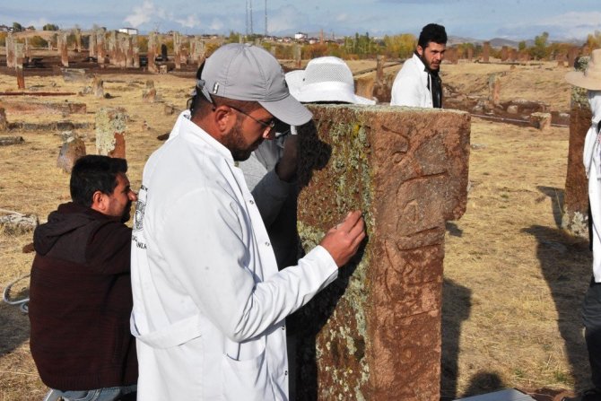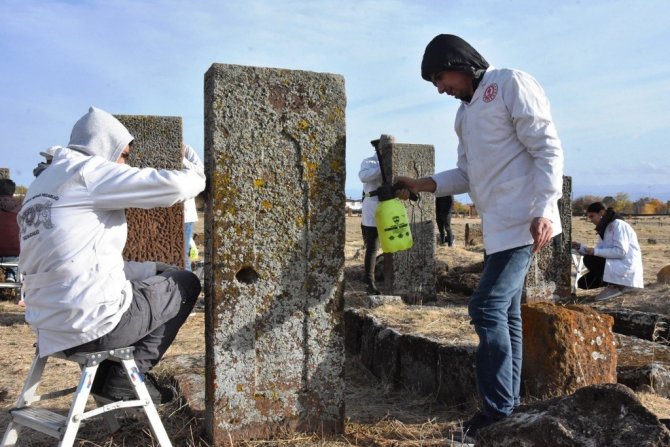 Bitlis'in Ahlat ilçesinde bulunan tarihi Selçuklu Mezarlığı'nda yapılan liken temizliği tarihe ışık tutuyor.