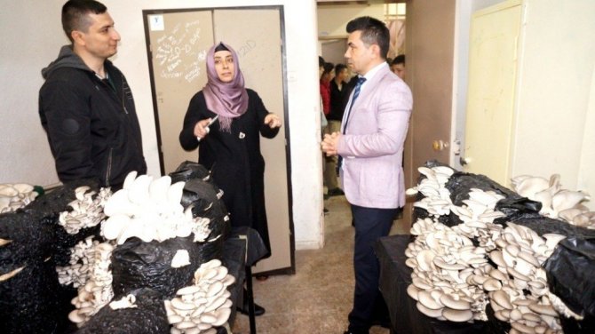 Sarıgöl Milli Egemenlik Çok Programlı Anadolu Lisesinin bodrum katında üretilen istiridye mantarları yoğun ilgi görüyor. Öğrencilerin yetiştirdiği mantarların kilosu 10 TL’den satılırken elde edilen gelirle okulun ihtiyaçları karşılanıyor. Sarıgöl Kaymakamı Çetin Kılınç da okulu ziyaret ederek çalışmalar hakkında bilgi aldı.