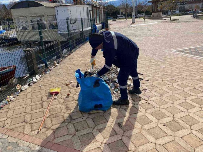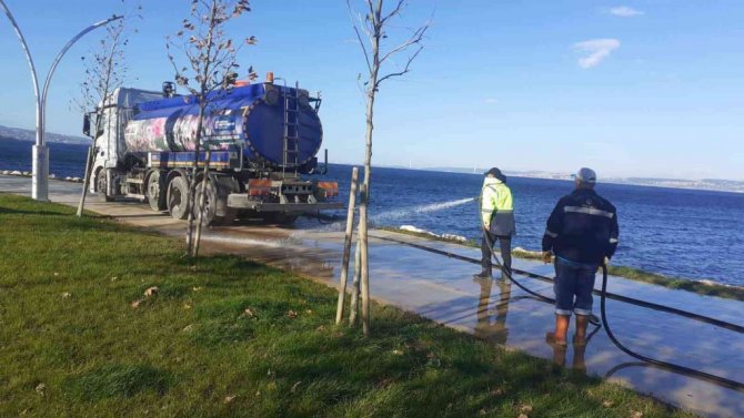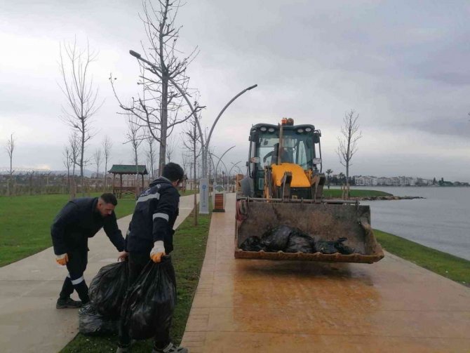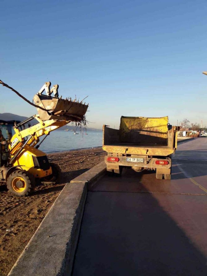 Ekipler, temizlik araçlarıyla birlikte lodos nedeniyle sahillerde toplanan atıkları temizledikten sonra tazyikli suyla da temizlik yaptı.