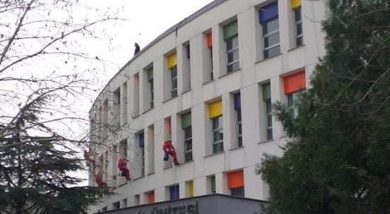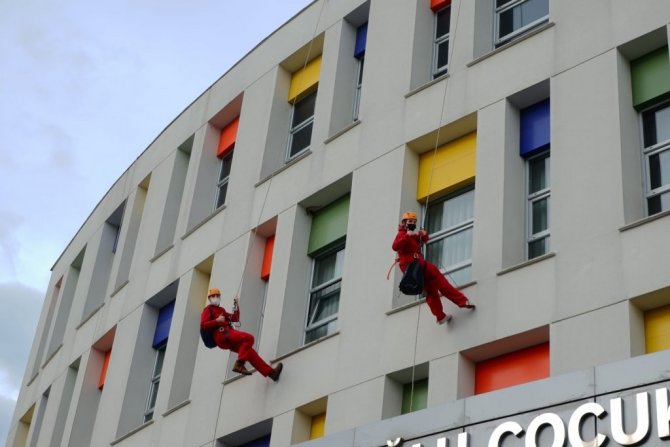 Bursa Uludağ Üniversitesi öğrencileri tarafından kurulan "Renkli Gülücükler Topluluğu', Sabahattin Gazioğlu Çocuk Hematoloji ve Onkoloji Hastanesi'ne camdan tırmanarak, çocuklara hediyeler verdi.