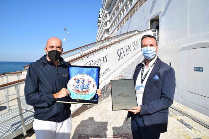 Seven Seas Splendor isimli kruvaziyer gemisinin Türkiye'deki ilk seferi Kuşadası limanına yapması dolayısıyla Ege Port Kuşadası Genel Müdürü Aziz Güngör, Seven Seas Splendor gemisinin kaptanı Dıego Mıchelozz'ye plaket takdim etti.