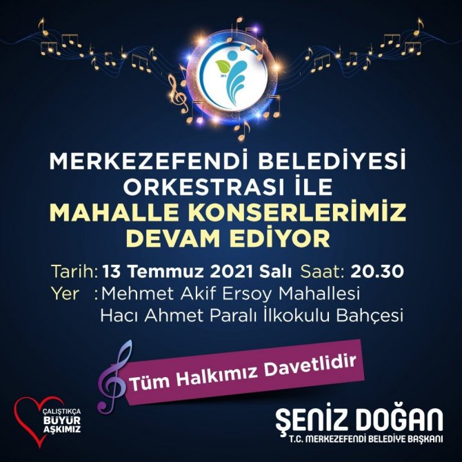 Merkezefendi Belediyesi, sanatseverleri açık hava konserleriyle buluşturmaya devam ediyor. Bu kapsamda Merkezefendi Belediye Orkestrası ikinci mahalle konserini 13 Temmuz Salı günü Mehmet Akif Ersoy Mahallesi'nde gerçekleştirecek. Saat 20.30'da başlayacak konser Hacı Ahmet Paralı Paralı İlkokulu Bahçesi'nde yapılacak. Merkezefendi Belediye Başkanı Şeniz Doğan, "Sanat ve kültür alanındaki çalışmalarımız tüm hızıyla devam ediyor. İlkini Karahasanlı Mahallesi'nde gerçekleştirdiğimiz konserlerimizin ikincisini Mehmet Akif Ersoy Mahallemizde yapıyoruz. Normalleşme ile konserlerimizi hemşehrilerimizle birlikte gerçekleştireceğiz, yan yana olacağız. Merkezefendi Belediyesi olarak kültüre, sanata ve sanatçıya önem vermeye devam edeceğiz. Tüm hemşehrilerimi Mehmet Akif Ersoy Mahallesi Hacı Ahmet Paralı Paralı İlkokulu Bahçesi'nde yapılacak konserimize davet ediyorum" diye konuştu.