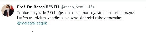 İl Sağlık Müdürü Prof. Dr. Recep Bentli, sosyal medya hesabında yaptığı açıklamada, "Toplumun yüzde 75'i bağışıklık kazanmadıkça virüsten kurtulamayız. Lütfen aşı olalım, kendimizi ve sevdiklerimizi riske atmayalım" dedi. Malatya'da nüfusun yüzde 40'nın hala birinci doz aşısını yaptırmadığına dikkat çeken Bentli, yoğun bakımda yatan hastaların yüzde 95'inin aşı olmayanlardan oluştuğuna işaret etti.