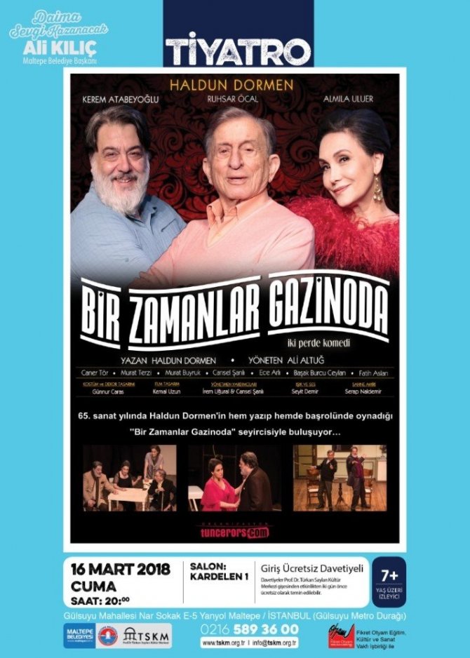 27 Mart Dünya Tiyatrolar Günü, 23-28 Mart tarihlerinde “Tiyatro Günleri” ile kutlanacak. Haldun Dormen’in yazıp oynadığı, Kerem Atabeyoğlu, Ruhsar Öcal, Almila Uluer’in de sahne alacağı “Bir Zamanlar Gazinoda” isimli komedi oyunu da mart ayı etkinliklerinde, tiyatroseverlerle buluşacak.