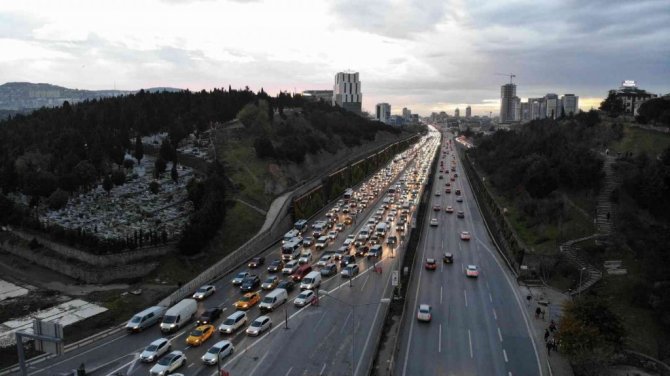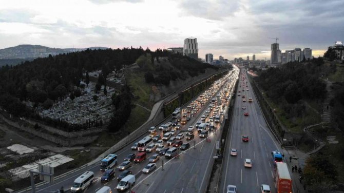 Öte yandan araç sürücülerinin ilerlemekte zorluk yaşadıkları uzun trafik kuyruğu havadan görüntülendi.
