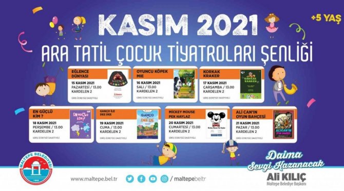 Maltepe Belediyesi, Maltepeli öğrencileri 15-19 Kasım tarihlerinde gerçekleşecek birinci dönem ara tatilinde, "Ara Tatil Çocuk Tiyatroları Şenliği" ile buluşturacak. 15-21 Kasım tarihlerinde ücretsiz düzenlenecek şenlikte her gün farklı bir tiyatro oyunu sahnelenecek. Şenlik perdelerini 15 Kasım'da saat 13.00'da Halit Karaata'nın yazdığı, Dramatik Sahne'nin, "Eğlence Dünyası" isimli oyunuyla açacak.
