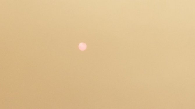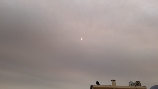 Manisa'da sabah saatlerinde orman yangınlarının dumanlarının Afrika'dan gelen toz taşınımıyla birlikte güneşin kaybolmasına neden oldu.
