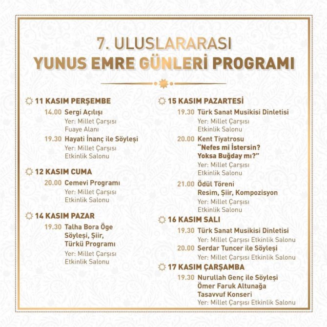 Bu yıl da güzel bir program hazırladıklarını kaydeden Yunusemre Belediye Başkanı Dr. Mehmet Çerçi etkinliklere Manisalıları davet etti. Başkan Çerçi etkinlileri Yunus Emre Millet Çarşısı Etkinlik Salonu'nda gerçekleştireceklerini belirterek, "Yunus Emre'yi anmak, anlamak, felsefesini, öğretilerini dünyaya duyurmak, sevdirmek ve tanıtmak amacıyla Yunus Emre'nin ismini taşıyan bir belediye olarak güzel bir organizasyon yapıyoruz. Geçtiğimiz yıl koronavirüs pandemisi dolayısıyla yapamamıştık. Bu yıl organizasyonumuzun 7.sini yapacağız. Belediye olarak, onun mesajlarının günümüze taşınması ve anlaşılması noktasında üzerimize düşeni yapacağız. Etkinliklerimizi Yunus Emre Millet Çarşısı Etkinlik Salonunda yapacağız. Vatandaşlarımızı gerçekleştireceğimiz bu güzel etkinliklere davet ediyoruz" dedi.