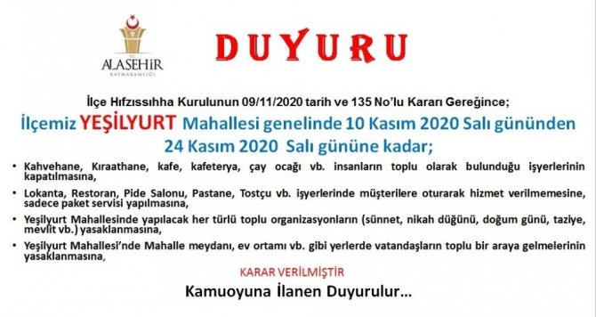 Alaşehir kaymakamlığından yapılan açıklamada, "Manisa’nın Alaşehir ilçesine bağlı, Yeşilyurt Mahallesi 10.11.2020 tarihi itibariyle; korona virüs salgınından vatandaşları korumak ve salgının yayılmasını önlemek amacıyla İlçe Umumi Hıfzıssıhha Kurulunun 10/11/ 2020 tarihli ve 136 sayılı kararı ile 14 gün süresince kahvehane, kıraathane, kafe, kafeterya, çay ocağı gibi insanların toplu olarak bulunduğu işyerlerinin kapatılmasına, lokanta, restoran, pide salonu, pastane, tostçu gibi işyerlerinde müşterilere oturarak hizmet verilmemesine, sadece paket servisi yapılmasına, Yeşilyurt Mahallesinde yapılacak her türlü toplu organizasyonların sünnet, nikah düğünü, doğum günü, taziye, mevlit gibi yasaklanmasına, mahalle meydanı, ev ortamı gibi yerlerde vatandaşların toplu bir araya gelmelerinin yasaklanmasına, karar verilmiştir" denildi.