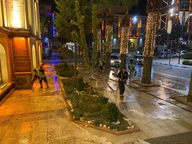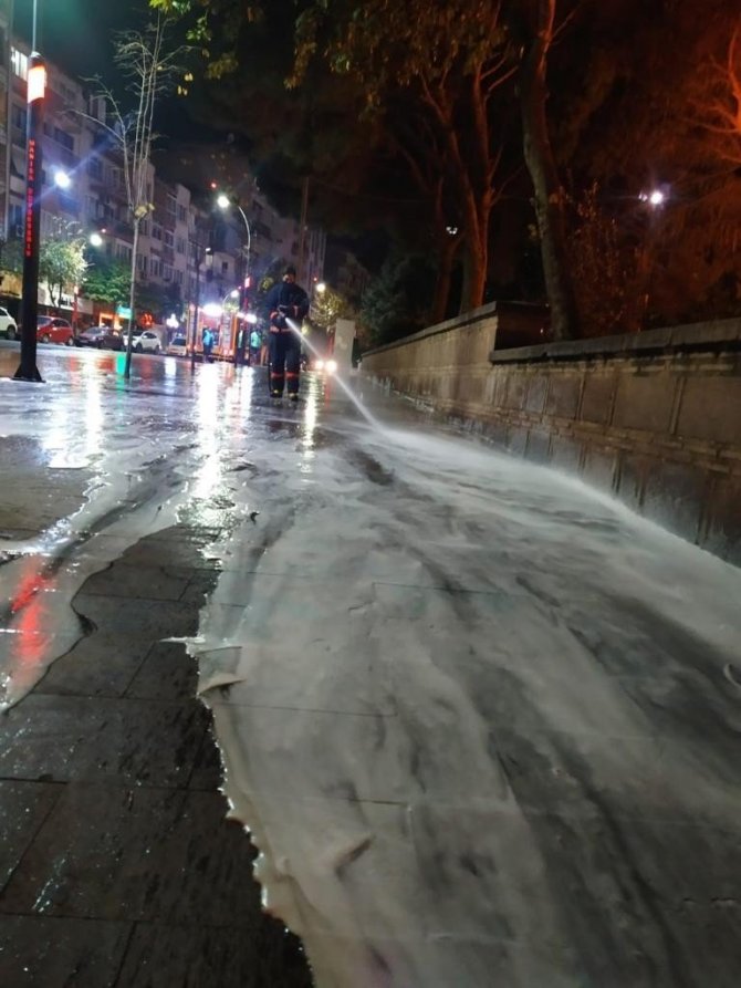 Manisa il genelinde korona virüs tedbirlerini titizlikle uygulayan ve dezenfeksiyon çalışmalarını aralıksız sürdüren Manisa Büyükşehir Belediyesi, şehir merkezinde vatandaşların yoğun olarak kullandığı alanlarda temizlik çalışması gerçekleştirdi. Manisa Büyükşehir Belediyesi İtfaiye Dairesi Başkanlığı ile Çevre Koruma ve Kontrol Dairesi Başkanlığı ekipleri, yaya ve trafik yoğunluğunun az olduğu gecenin ilerleyen saatlerinde şehri baştan aşağı pırıl pırıl yaptı. Cadde, sokak, bulvar gibi sorumluluk alanında bulunan bölgeleri dezenfekte eden ekipler, vatandaşların takdirini topladı.