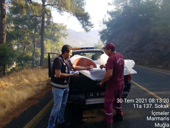 Marmaris Belediyesi de yangının başladığı andan itibaren tüm personeliyle seferber oldu. Zabıta, fen, destek, temizlik, park ve bahçeler gibi birimlerden ekipler yangını söndürmek için itfaiyecilerle birlikte çalışmalara katıldı. Kültür ve Sosyal İşler Müdürlüğü de arazide çalışanlara su ve gıda takviyesi sağlamak için ilçenin 2 noktasında koordine merkezi kurdu. Buradan araçlarla yangın bölgelerine dağıtım sağlandı. Yangın nedeniyle Marmaris-İçmeler karayolu ulaşıma kapanırken, büyük korku yaşayan mahalle sakinleri ve turistler teknelerle Marmaris merkeze taşındı. Buradan da Marmaris Belediyesi, Ticaret Odası ve otellerin organizasyonu ile otellere yerleştirildi.