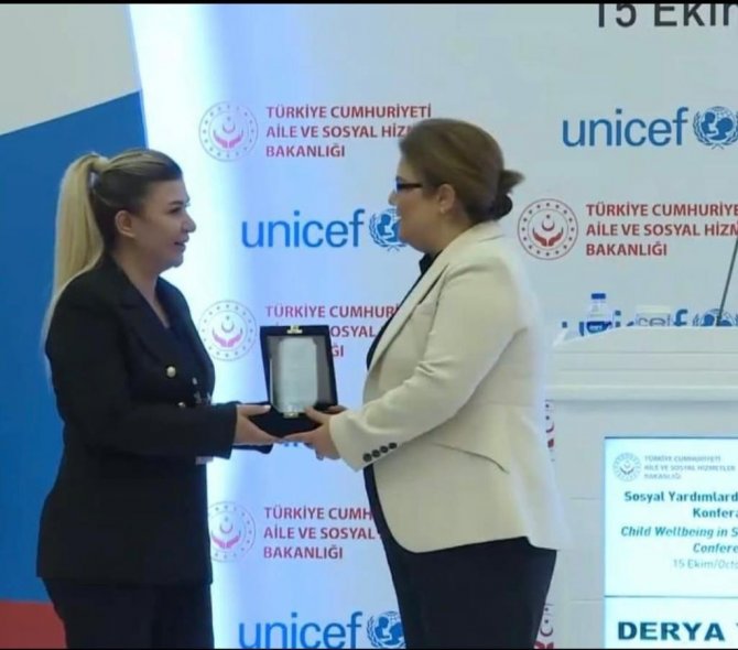 Ankara Ticaret Odası Kongre ve Fuar Merkezinde düzenlenen ve UNICEF Türkiye temsilcisi Regina De Dominics "inde katılımcı olarak iştirak ettiği "Sosyal Yardımlarda Çocuk Refahı" konulu konferansa davet edilen Marmaris Kaymakamlığı Sosyal Yardımlaşma ve Dayanışma Vakfı Müdiresi Evrim Koçlar Çağlayan teşekkür plaketini Bakan Derya Yanık'tan teslim aldı.