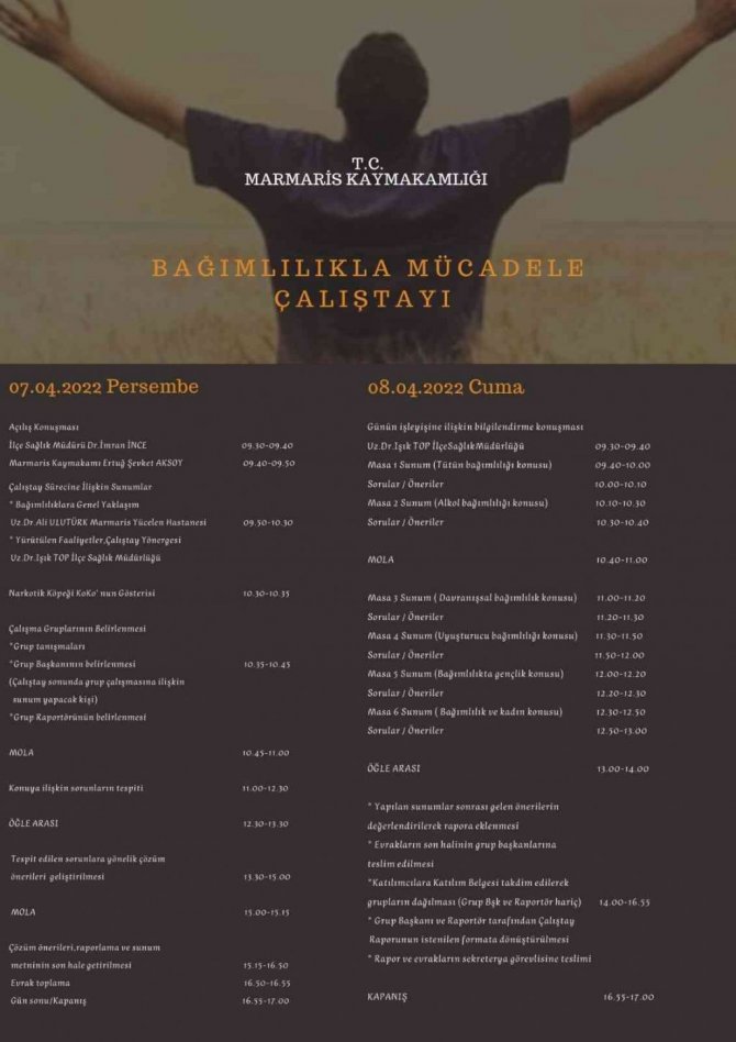 Marmaris Kaymakamı Ertuğ Şevket Aksoy modernleşen zaman ile birlikte Bağımlılık ile mücadelenin önemini anlatan konuşmasında " Her alandaki bağımlılık tüm dünyayı etkilediği gibi ülkemizi de etkisi altına almıştır. Başta sağlık anlamında, sosyal, ekonomik anlamlarda toplumları olumsuz etkileyen kayıplara yol açan adeta bir insanlık kabusu haline geldi. Sizlerin bu konudaki bilgi ve deneyimlerinden, bilimsel birikimlerinden, yaşam tecrübelerinden, kişisel görüşlerinizden istifade etmek mümkün olduğunca en geniş katılım ile bu çalıştayı düzenledik. Aslında yaşamımızın her anında yaptığımız bir işi bir bilimsel formatta tekrar ele alarak ben olsaydım diyerek, verimli ve fayda sağlayacağı bir çalıştay olacağını umuyorum ve sizlere teşekkür ediyorum " sözleri ile toplantıya katılanlara seslendi.