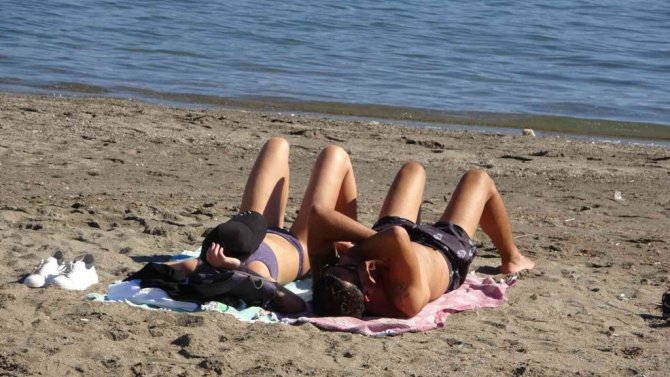 Hava sıcaklığının 30 derece olarak hissedildiği Marmaris'te iskeleler boş ama plajlarda güneşlenen ve denize girenler çok.
