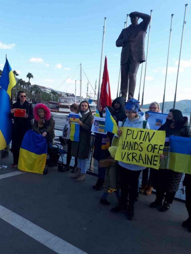 Marmaris'te yerleşik yaşayan Ukraynalılar çocuklarıyla birlikte Kordon Caddesi üzerinde bulunan Atatürk anıtının önünde toplandı. Kadın ve çocuklar ellerinde "Putin dur', "Putin geri çekil', "Barış istiyoruz" yazılı Türkçe, İngilizce ve Rusça pankartlarla "Savaşa hayır" sloganı attı. Yerleşik yaşayan ve çoğu Türkler ile evli yaklaşık 50 kişilik grup 15 dakika slogan atıp, 15 dakika da sessizce bekleyerek savaşı protesto etti. Ukrayna milli marşının söylenmesi ardından sessizce dağılan grup eylemlerini farklı günlerde tekrarlayacaklarını belirtti.