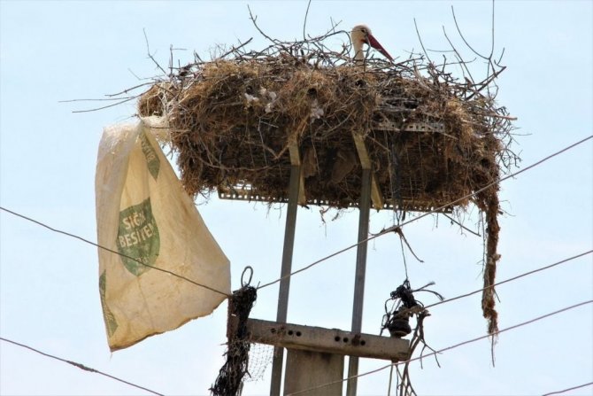 Aydın'ın Söke ilçesindeki leylek yavruları büyümeye başlarken, çevresel atıklarla birlikte şimdi de etrafa atılan tıbbi maskeler leylek yavrularını tehdit ediyor.
