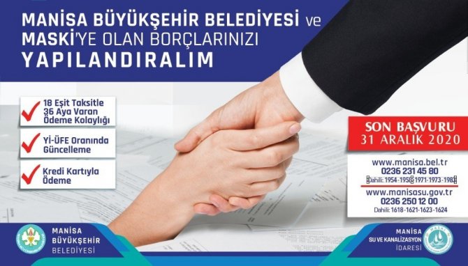 MASKİ Genel Müdürlüğüne borcu olan vatandaşlar veya mükelleflerin, ‘Bazı Alacakların Yeniden Yapılandırılması ile Bazı Kanunlarda Değişiklik Yapılması Hakkında Kanun’ kapsamında, borçların yeniden yapılandırılması için 31 Aralık 2020 günü mesai bitimine kadar başvuru yapabilecekleri duyuruldu. Yapılan açıklamada şu ifadelere yer verildi: “17 Kasım 2020 tarihli 31307 sayılı Resmi Gazetede yayımlanarak yürürlüğe giren 7256 sayılı Bazı Alacakların Yeniden Yapılandırılması ile Bazı Kanunlarda Değişiklik Yapılması Hakkında Kanun hükümleri kapsamında; MASKİ Genel Müdürlüğüne 31.08.2020 tarihi itibariyle ödenmesi gereken vergi ve diğer borçların gecikme zamları ve faizlerinde Yİ-ÜFE (Yurt İçi Üretici Fiyat Endeksi) oranında güncelleme yapılması, Peşin ödemelerde Yurt İçi ÜFE oranında hesaplanan tutardan ayrıca yüzde 90 indirim, vergi aslına bağlı cezaların (vergi ziyaı) tamamen silinmesi, vergi aslına bağlı olmayan usulsüzlük ve özel usulsüzlük cezalarında yüzde 50 indirim uygulanması, yapılandırılan tutarların ikişer aylık dönemler halinde 36 aya varan sürelerde taksitle ödenmesi, yapılandırılan borçların peşin ve taksit ödemelerinde, MASKİ Genel Müdürlüğünün anlaşmalı olduğu banka kredi kartları ile peşin veya taksitli olarak ödenmesi gibi imkanlar da mükelleflere sağlanmıştır. Başvurular için MASKİ Genel Müdürlüğü Hizmet Binası ile Yarhasanlar MASKİ Ek Hizmet Binasında, merkez ilçeler dışında ilçe şefliklerine Borç Yapılandırma işlemleri Müracaat ve Başvuru Noktaları oluşturulmuştur. Şehzadeler ve Yunusemre ilçelerinde ikamet eden vatandaşlarımız belirtilen bu başvuru ve müracaat noktalarından 31 Aralık 2020 günü mesai bitimine kadar başvuru yapabileceklerdir."